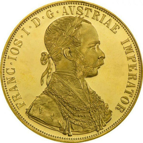 A 4 dukátos arany érme, akárcsak az 1 dukátos aranyérme. Ezek az osztrák érmék mind az 1916-ban elhunyt I. Ferenc József császárnak emlékére készültek.