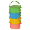 Színes ételhordó, műanyag ételesdoboz 4 részes kivitelben, amely az élelmiszerek szállítására és tárolására szolgál. Minden tál külön műanyag fedéllel van ellátva. Praktikus fogófüle a négy részt szállítás, emelés közben összetartja. Mikrohullámú sütőben