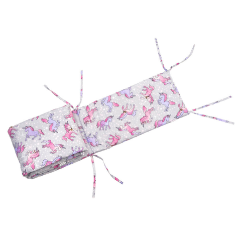 a fejvédőt a kiságy belsejében a fejrésznél félkör alakban a rácshoz kötjük, így a kisbaba véletlenül sem üti be a fejét a rácsokba többféle színben és bájos mintákkal kapható anyaga: 67% pamut, 33% poliészter, a töltőanyag 100% műszál mérete: 20x140 cm