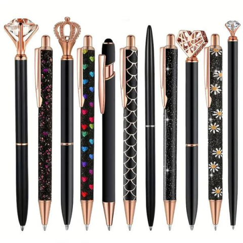 5 db díszes Golyóstoll Készlet – Fekete MK1614485-FEz az 5 darabos, elegáns golyóstoll szett stílusos kiegészítője bármely tolltartónak vagy irodai asztalnak. A fémtestű tollakat különleges csillámos, kristályos, gyöngyös vagy szívecskés díszítés teszi egyedivé, így tökéletesek ajándéknak is tanároknak, diákoknak vagy akár esküvői vendégkönyvekhez.Főbb jellemzők:Anyag: Tartós fém ház, díszített fej (kristály, gyöngy, szív stb.)Méret: 14 cm hossz