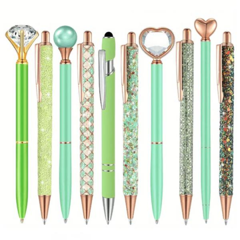 5 db díszes Golyóstoll Készlet – Zöld MK1614485-Z Ez az 5 darabos, elegáns golyóstoll szett stílusos kiegészítője bármely tolltartónak vagy irodai asztalnak. A fémtestű tollakat különleges csillámos, kristályos, gyöngyös vagy szívecskés díszítés teszi egyedivé, így tökéletesek ajándéknak is tanároknak, diákoknak vagy akár esküvői vendégkönyvekhez.Főbb jellemzők:Anyag: Tartós fém ház, díszített fej (kristály, gyöngy, szív stb.)Méret: 14 cm hossz
