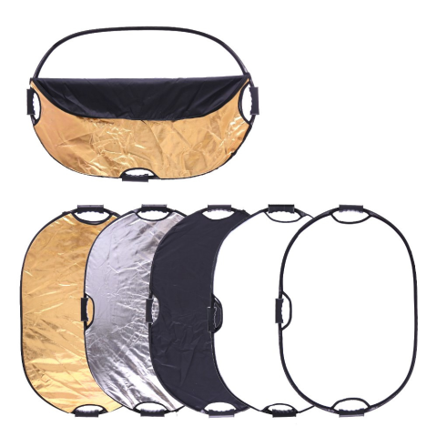 Fényképészeti reflektor, derítőlap, 5 az 1-ben derítő - 90x120 cm fogyantyúval Eliptikus alakú, ovális fotós derítőlap, amely egyszerre szolgálhat a fény irányításában fontos eszközként akár portré vagy tárgyfotózásban és videómunka során, akár egységes h