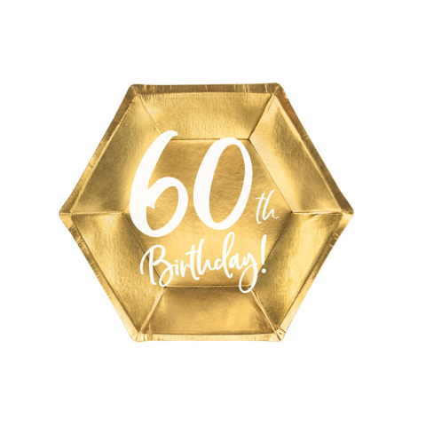Papírtányérok arany metál színben, fehér 60th Birthday! felirattal, mérete kb. 20 x 17 cm. (1 db / 6 db.)