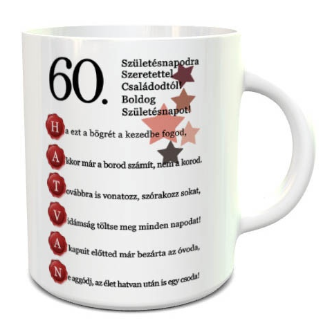 60. születésnapra ajándék, születésnapi bögre. Ez a bögre tökéletes ajándékötlet azoknak, aki valami egyedivel szeretnének kedveskedni. A bögre különlegessége, hogy a 60-as szám mellé egyedi feliratot és kérhetsz, így személyesebbé téve a meglepetést. Bög
