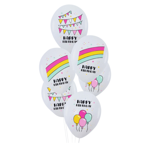 Tedd varázslatossá a születésnapi ünnepséget ezzel a vidám és színes 6 darabos latex lufi szettel. A szivárványos minta és a Happy Birthday felirat egyedi és ünnepi hangulatot kölcsönöz minden eseménynek, így tökéletes választás bármilyen korosztály számá