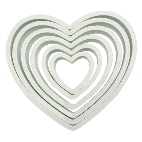 6 darabos műanyag süteménykiszúró, melynek segítségével igazán változatos méretű szív alakú süteményeket tudsz készíteni. A formákat használhatód marcipán és fondant díszek elkészítésénél is. Tulajdonságok: Anyaga: műanyag A kiszúrók méretei: (átmérő)