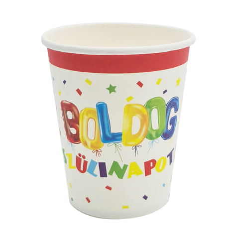 6 darabos papír pohár Boldog szülinapot felirattal, mellyel pillanatok alatt teremthetsz vidám hangulatot az ünnepi asztalra, és varázsolhatsz egy különleges dekorációt minden születésnapos bulijára. Tulajdonságok: Anyaga: papír A papír pohár űrtartalma