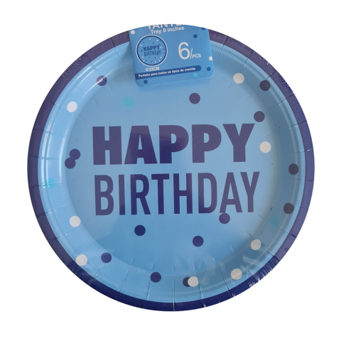 6 darabos kék színű, Happy Birthday feliratú papír tányér, mellyel feldobhatod minden szülinapos ünnepi asztalát. Tulajdonságok: Anyaga: papír A papír tányér mérete: 22,5 cm átmérő A csomagban 6 darab azonos mintájú tányér található.