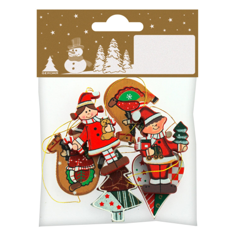 A felakasztható, színes fa figurák egy 6 darabot tartalmazó tasakban találhatók. A következő motívumokat tartalmazza: karácsonyfa, szív, hintalovon ülő gyermek, fiú és lány. Elhelyezheti a falon, ajándékokat díszíthet vele, vagy a karácsonyfára akaszthatja. Az aranyszínű szalagnak (amelyre egy fehér gyöngy van rögzítve) köszönhetően eldöntheti, hogy hol kívánja elhelyezni a függődíszt. Mindegyik függődísz 4,5 cm magas, és finoman kidolgozott színes motí