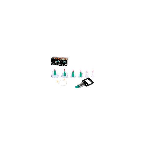 Köpölyöző vákuum szett.6 különböző méretű hengert helyezhet el egyénileg a test különböző pontjain.Használata után a vákuum elkészül, eltávolítható a palack anélkül, hogy a levegő távozna. A vákuumot lehet oldani bármikor a hengerfejnél.A hengerek, átlátszó műanyagból készült, belső átmérő: 25-59 mm.A henger mélysége 37 mm-től 55 mm-ig.A teljes készlet:kézi pumpa, csatlakozó tömlő ,6 szivattyú henger stimuláló a mellbimbó vagy kórházi ját