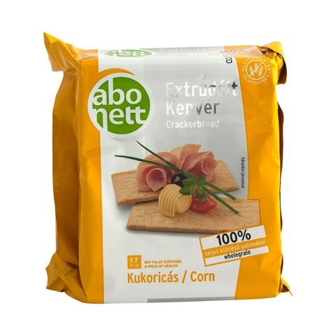 A Extrudált kenyér, ABONETT, 100 g, kukoricás, gluténmentes (KHE057) A teljes kukoricaszem felhasználásával készült ropogós finomság. Ízletes, alacsony energiatartalmú, élelmi rostban gazdag ropogtatnivaló a kukorica tradicionális ízeit kedvelők számára,