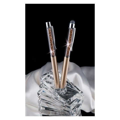 Elegáns kivitelű, kiváló minőségű, eredeti Swarovski® kristályokkal töltött golyóstoll. A tolltest fém, logózható, lézergravírozható. Elegáns ajándék magánszemélyek és cégek részére. Tolltest színe: arany. Kristály színe: topáz. Betét színe: kék. Vonalvas