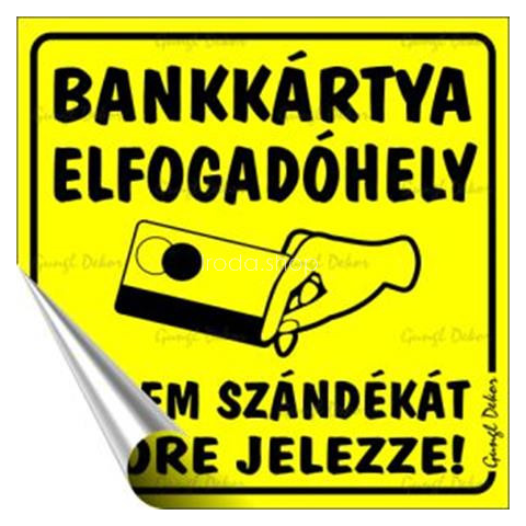 Információs matrica, 10x10 cm, Bankkártya elfogadóhely Bankkártya elfogadóhely. Kérem szándékát előre jelezze! információs matrica - anyaga: öntapadós műanyag fólia (vinil) - damil akasztót nem tartalmaz - sárga alapon fekete betűk - mérete: 10x10 cm