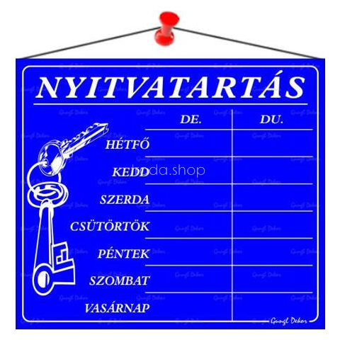 Információs tábla, 20x17,5 cm, Nyitvatartás, kék Nyitva tartás információs tábla, 7 napos. - kék alapon fehér szöveg - anyaga: hullámos műanyaglemez, damil akasztóval - a termék tartalmaz egy öntapadós betű-szám lapot, mellyel a kívánt időpontok kiírh