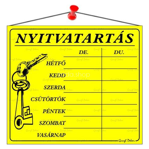 Információs tábla, 20x17,5 cm, Nyitvatartás, sárga Nyitva tartás információs tábla, 7 napos. - sárga alapon fekete szöveg - anyaga: hullámos műanyaglemez, damil akasztóval - a termék tartalmaz egy öntapadós betű-szám lapot, mellyel a kívánt időpontok