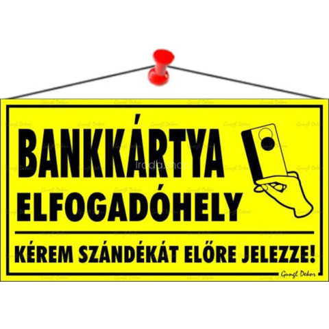 Információs tábla, 22,5x12,5 cm, Bankkártya elfogadóhely Bankkártya elfogadóhely információs tábla - sárga alapon fekete szöveg - anyaga: hullámos műanyaglemez, damil akasztóval - mérete: 22,5x12,5 cm