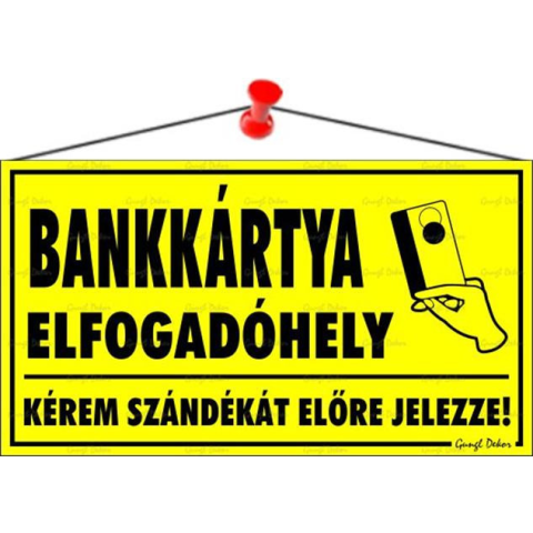Információs tábla, 22,5x12,5 cm, Bankkártya elfogadóhely Bankkártya elfogadóhely információs tábla - sárga alapon fekete szöveg - anyaga: hullámos műanyaglemez, damil akasztóval - mérete: 22,5x12,5 cm