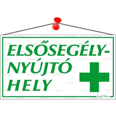 Információs tábla, 22,5x12,5 cm, Elsősegélynyújtó hely Elsősegélynyújtó hely információs tábla - fehér alapon zöld szöveg - anyaga: hullámos műanyaglemez, damil akasztóval - mérete: 22,5x12,5 cm
