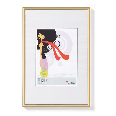 Képkeret, műanyag, 13x18 cm, New Lifestyle, arany vékony, gömbölyű léccel fémes hatású festéssel közepén perforációval, melyet kiemelve a megmaradt rész paszpartuként használható hátlapja farostlemez, kitámasztóval fektethető és állítható, valamint aka