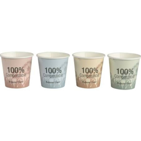 Papír pohár, komposztálható, 2,4 dl, vegyes színek (KHMU181) PLA bevonatos papír pohár biológiailag lebomló, növényi alapú komposztálható termék kiszerelés: 50 db/csomag, 20 csomag/karton űrtartalom: 2,4 dl átmérő: 80 mm vegyes színek, a szín nem vála