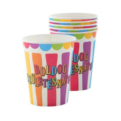 Pohár, papír, 2,5 dl, Boldog születésnapot, csíkos-pöttyös (PTF440121) Boldog születésnapot felirattal papír alapanyag űrtartalom: 2,5 dl Gyártó/első EU forgalmazó elérhetősége: Funny Box Kft. 2083 Solymár, Mátyás király u.70. info@funnybox.hu www.pa