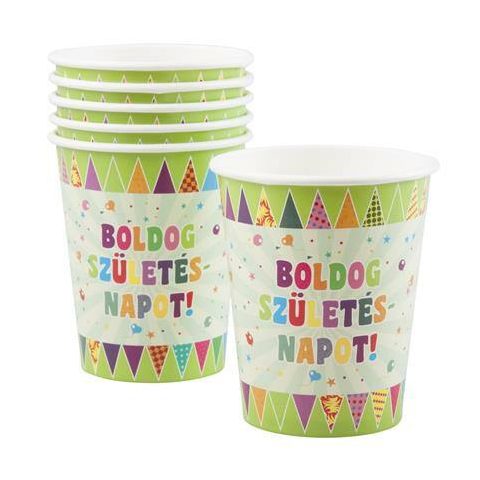 Pohár, papír, 2,5 dl, Boldog születésnapot, zászlós (PTFUN046) - űrtartalom: 250 ml Gyártó/első EU forgalmazó elérhetősége: Funny Box Kft. 2083 Solymár, Mátyás király u.70. info@funnybox.hu www.partypoint.hu