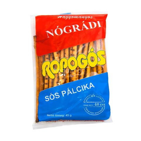 Ropi, 45 g, Nógrádi Nógrádi ropogós sós pálcika, a hagyományos ízek kedvelőinek. Összetevők: búzaliszt , sütőmargarin (növényi olajok és zsírok: napraforgó olaj, pálmaolaj; ivóvíz, emulgeálószer: zsírsavak mono- és digliceridjei; étkezési só, savanyús