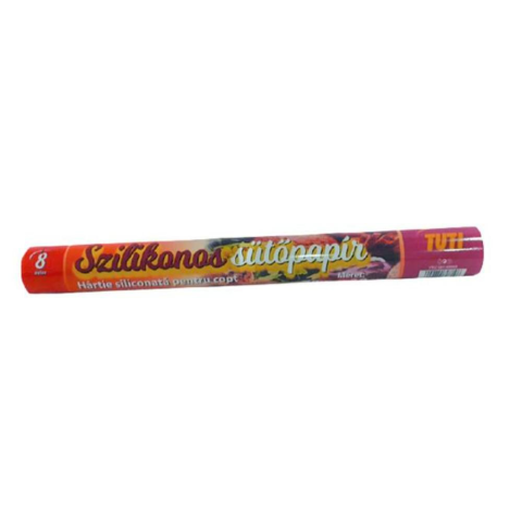 A Sütőpapír, szilikonos, 8 m, TUTI (KHT964) Speciális, mindkét oldalán vékony szilikonbevonattal ellátott, íz-, és szagsemleges sütőpapír, mely a sütéshez akár több alkalommal is felhasználható. - méret: 8 m x 38 cm-hez készült, kiváló minőségű nyomtatás