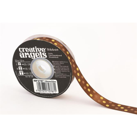 . Szatén szalag, 15 mm x 22 m, bronz vegyes pötyökkel (ISKE235)