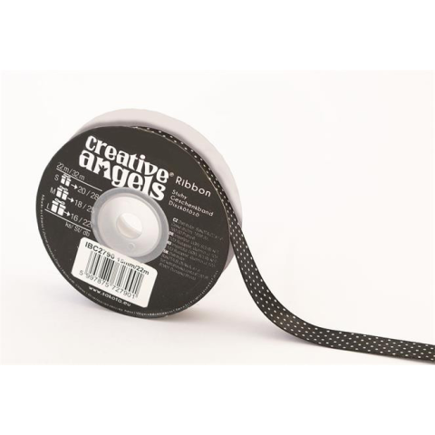 . Szatén szalag, 15 mm x 22 m, fekete fehér pötyökkel (ISKE238)