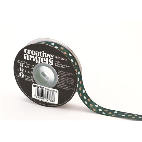 . Szatén szalag, 15 mm x 22 m, sötétzöld vegyes pötyökkel (ISKE236)