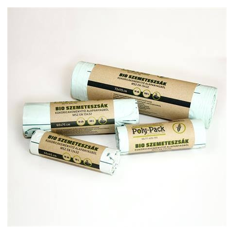 Szemeteszsák, lebomló, 60x75 cm, 60 l, 10 db (KHT703) Környezetbarát, komposztálható, biológiai úton lebomló (PLA), megújuló forrásból származó, kukoricakeményítő alapú szemeteszsák. Megfelel az MSZ EN 13432:2000 szabványnak. 60x75 cm 60 liter 10 db