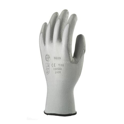 Szerelőkesztyű, tenyéren mártott 7-es méret, szürke kötött, rugalmas, nagy szakítószilárdságú 100% poliészter szál tenyéren poliuretánnal mártott gumírozott mandzsettával szellőző kézháttal szín: szürke Méret: 7 EU szabvány: EN420, EN388:2131 1