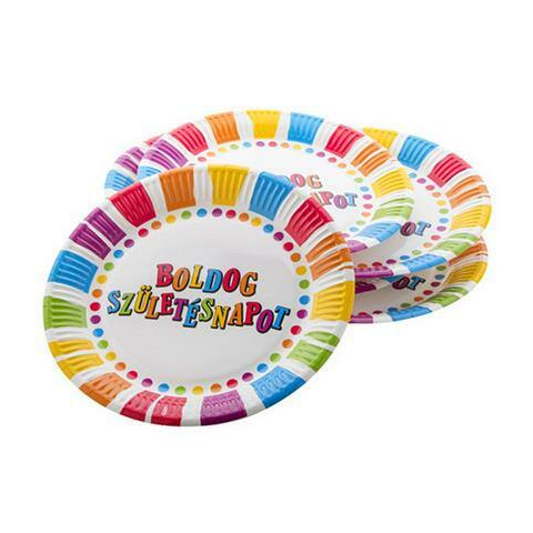 Tányér, papír, 23 cm, Boldog születésnapot, csíkos-pöttyös (PTF44312109) Boldog születésnapot felirattal papír alapanyag átmérő: 23 cm Gyártó/első EU forgalmazó elérhetősége: Funny Box Kft. 2083 Solymár, Mátyás király u.70. info@funnybox.hu www.party