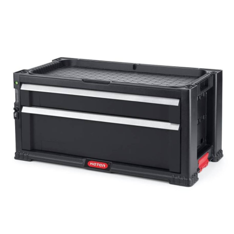 2 fiókos kerekes szerszámtároló. Mély fiókkal és kivehető válaszfalakkal nagyobb és nehezebb szerszámok tárolására. Praktikus, tágas fiókos tároló különböző nagyságú szerszám kényelmes, elkülönített tárolására. A termék 2 tágas fiókkal rendelkezik, lehetővé téve a termékek csoportosítását. Mély fiókkal és kivehető válaszfalakkal nagyobb és nehezebb szerszámok tárolására. További fiókok más szerszámok, tartozékok és kisebb tárgyak tárolására.