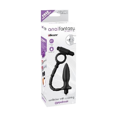 ASS-KICKER WITH COCKRING.Vibrátoros péniszgyűrű és vibrátoros anál plug szilikonból.Erős vibráció(mindkét rész 1db.AAA elemmel működik).Orvosi minőségű szilikonból készült.Higiénikus,könnyű tisztán tartani.A péniszgyűrű kezdeti átmérője:3.5cm(kellő méretre tágul-nyúlékony).Az anal plug hossza(behelyezhető):10cm,átmérője:1-3,2cm