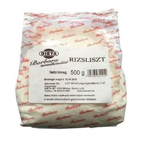 Barbara rizsliszt 500gA Barbara rizsliszt gluténmentes magyar termék. A rizsliszt előnye, hogy sütés során nincs szükség tojásra. Ennek eredményeképp a rizslisztből készült süteményeket tojásallergiában szenvedők vagy magas koleszterinszinttel rendelkezők