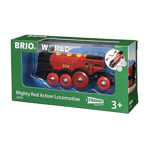 BRIO Nagy piros lokomotív Piros lokomotív hang és fényjelzéssel! A BRIO Nagy piros lokomotív egy négy tengelyes gőzmozdony, menet közben lámpája világít és jellegzetes gőzmozdony hangot utánoz A BRIO Nagy piros lokomotív tetején lévő sárga gombokkal v