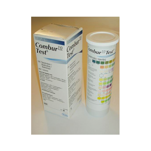 Combur 10 Test M vizelet teszt 100x Vizeletdiagnosztikai tesztcsík: fajsúly, pH, fehérvérsejt, nitrit, protein, cukor, aceton, urobilinogén, bilirubin és vér kimutatására. .
