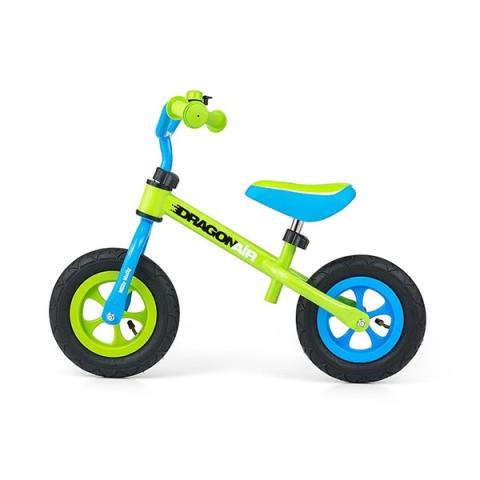 Milly Mally Dragon Air gyerek futóbicikli. Az ülés magassága állítható, csakúgy mint a kormány magassága. Stabil és könnyű acélkonstrukció. A kormány csúszásmentes gumifedéssel ellátott. Az ülés puha és kényelmes. 10-os félfújható gumi kerekei vannak. Cse