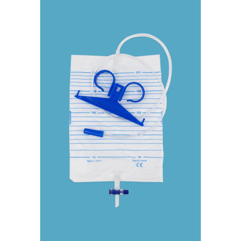 T-csapos steril vizeletgyűjtő zsák az Elysiumtól. Az akasztót is tartalmazó katéterzsák 2000 ml vizelet gyűjtésére alkalmas. A visszafolyásgátló, valamint leeresztő szeleppel is rendelkező vizeletgyűjtő zsák orvosi minőségű PVC-ből készült.