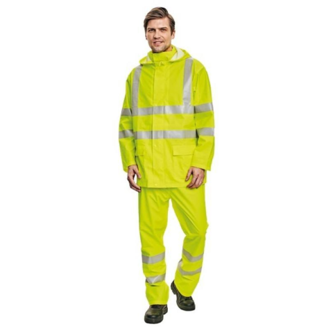 SIRET esőöltöny HV sárga 3XL • esőkabát gallérba hajtott kapucnival és rugalmas derekú nadrággal • puha poliészter szövet • 2 mély zsebfedős oldalzseb • patenttal szűkíthető mandzsetták • fényvisszavető csíkok az ujjakon, a vállakon és a test körül