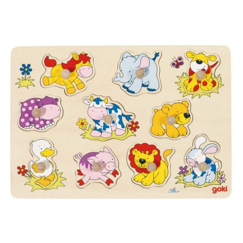 10 darabos fa fogós kirakó vidám, színes állatbébiket ábrázoló képekkel A fa fogantyúk megkönnyítik a kirakó elemek megfogását és segítenek a megfelelő helyre illesztésben. A játék közben fejlődik a kézügyesség, a finom motorikus készségek, a formafelismerés és megfigyelés készsége. A fa keret mérete: 30 x 21 cm.
