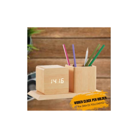 Letisztult, elegáns megjelenésű, sötét fa mintázatú többfunkciós asztali óra és eszköztartó. A csomagban található kábel segítségével USB portról működtethető, vagy pedig 3 db AAA elem szükséges a használatához.