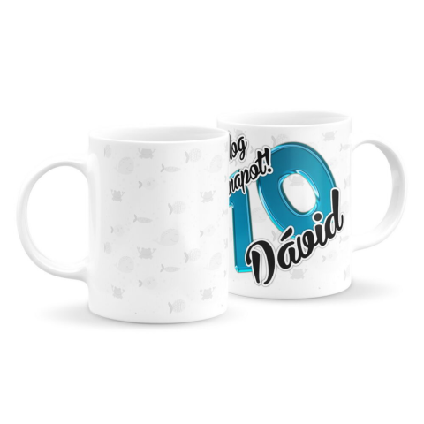 Férfi szülinapi bögre halacskás háttérrel (bármilyen névvel és számmal) bögrék, csészék árgrafikon