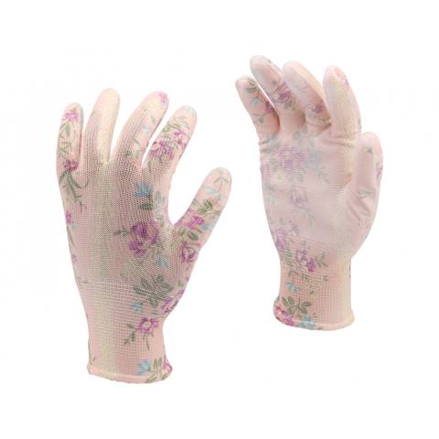 Könnyű kerti kesztyű poliészterből, virágmintás. A varrat nélküli kialakítás nagy kényelmet és kiváló tapintást biztosít. markolat rész: poliészter felső rész: poliészter rugalmas mandzsetta