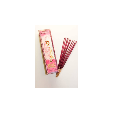 Shanti, Gold Prema füstölő Művészi kompozíciójaa levendula, a rózsa, a jázmin és a vetiver olajnak, a mindennapi stressz elleni, nyugtató illat, ösztönzi a szeretet érzését 10 szál/doboz égési idő: 40-50 perc/szál A termék tulajdonságai Gold Prema -