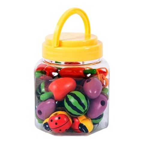 Fűzd zsinórra egymás után a zöldségeket, gyümölcsöket és díszítsd fel a konyhát! A Fűzhető fa gyümölcs készlet egy befőttes dobozban rejlik, tele ínycsiklandozó zöldségekkel és gyümölcsökkel. A fából készült növények közepe lyukas, hogy át tudd rajtuk fűzni a fonalat, ékszereket, vagy hosszú füzéreket alkotva. A fonalak fa tűkben végződnek, hogy minél könnyebb legyen elkészíteni a díszeket. Akaszd ki őket a konyhába, hogy mindenki gyönyörködhe