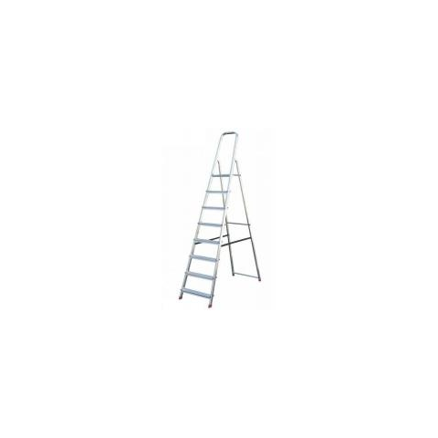 A háztartási alu létra 8 fokos (10358) csúszásmentes, műanyag stabilizátor talpakkal ellátott. Korrózióálló alumíniumból készült. A hosszú kapaszkodó által stabil munkavégzést biztosít.