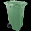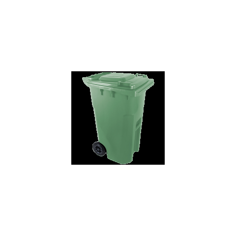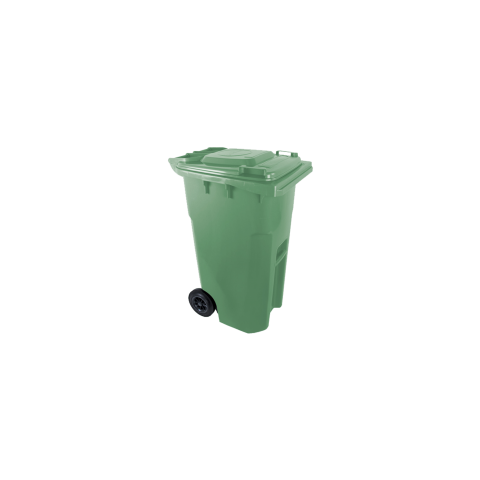 A zöld színű háztartási szemetes kuka űrtartalma 240 liter. Magassága 1050 mm, szélessége 580 mm, hossza 730 mm.